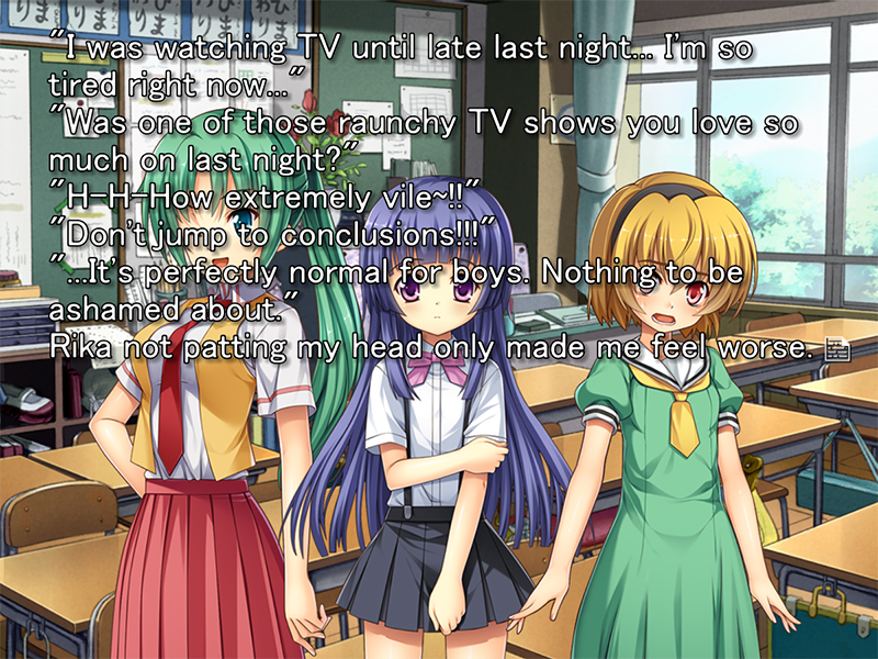 Mion Sonozaki, Rika Furude, and Satoko Hojo. Keiichi joins their after-school club activities,